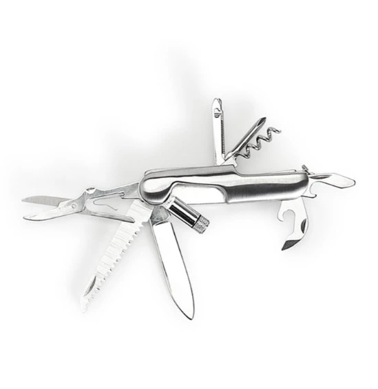 • Functions (13-in-1): Bottle opener, flathead screwdriver, Phillips screwdriver, key ring, scissors, LED light, corkscrew, saw, knife, can opener, nail file, nail cleaner, needle