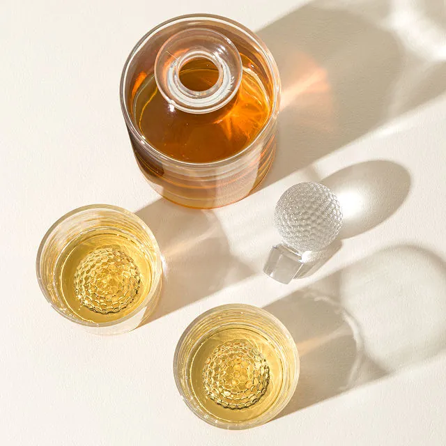 Pour your preferred whiskey, bourbon, or scotch into the decanter and use the matching glasses for serving. The textured golf-ball bases provide grip and playful design flair. Always handwash to maintain the crystal’s brilliance and avoid dishwasher damage.