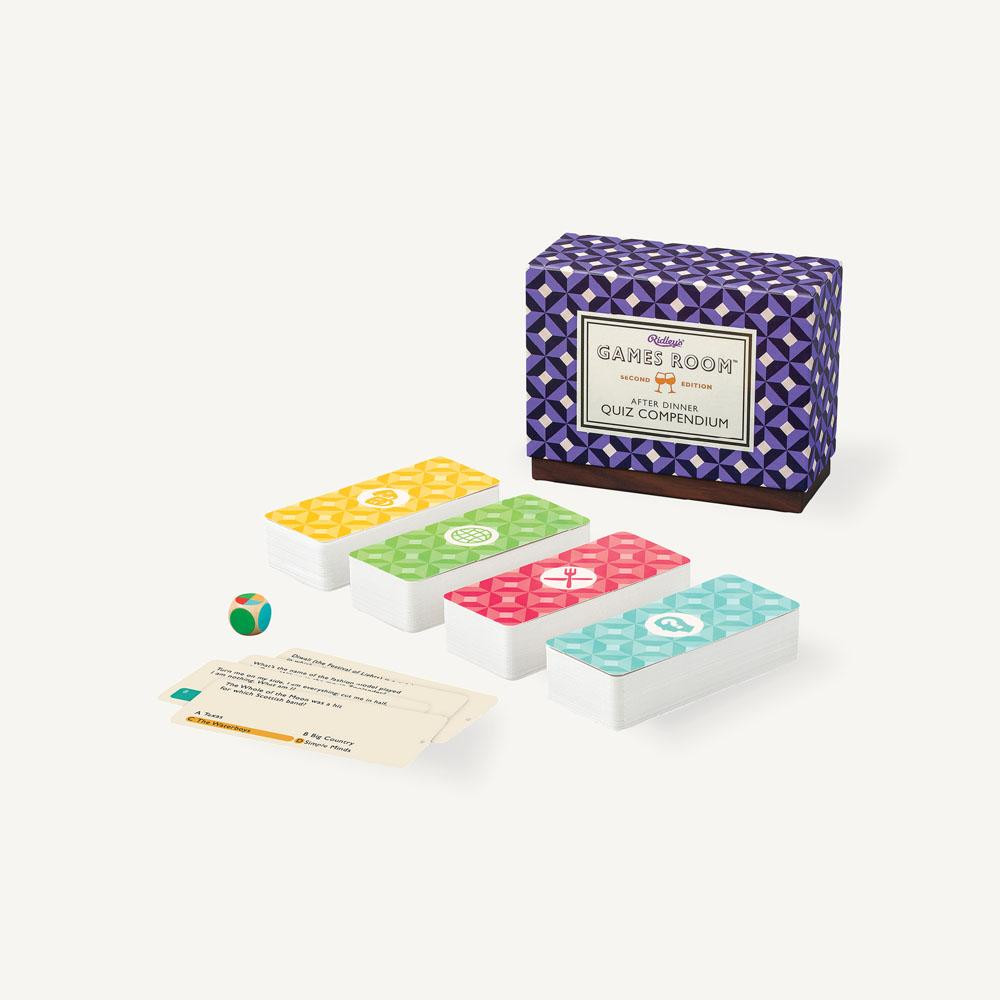 Enjoy post-meal fun with After Dinner Quiz Compendium. 280 quiz cards test knowledge in Culture, Travel, Food & Drink, Who Am I.
