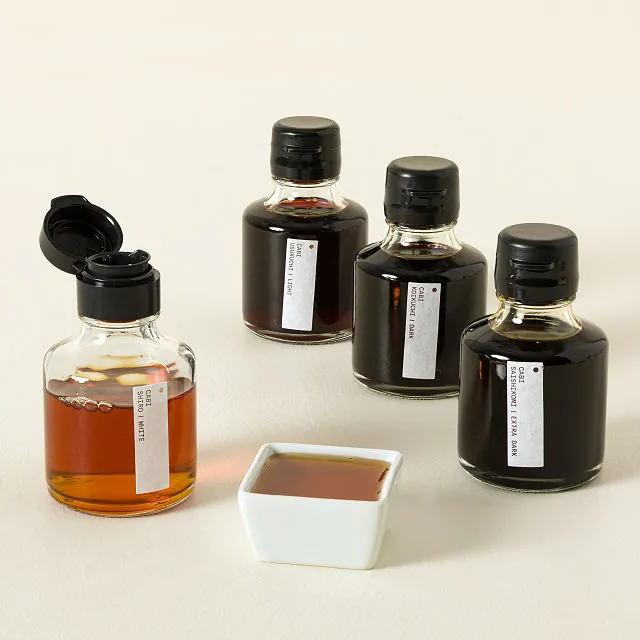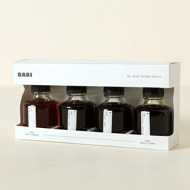 • Includes: 4 artisanal soy sauce bottles, 4 ceramic tasting plates, pairing guide