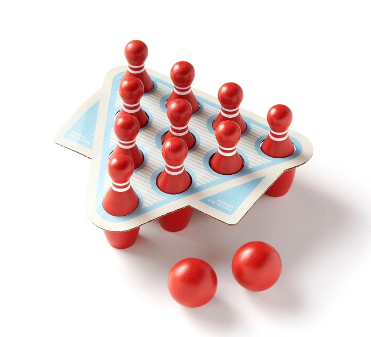 Set up the pins on any flat surface using the included pinsetter. Take turns rolling the ball to knock down pins while enjoying your beverage of choice. Follow the instructions for three different gameplay variations to match your group’s energy and fun level.