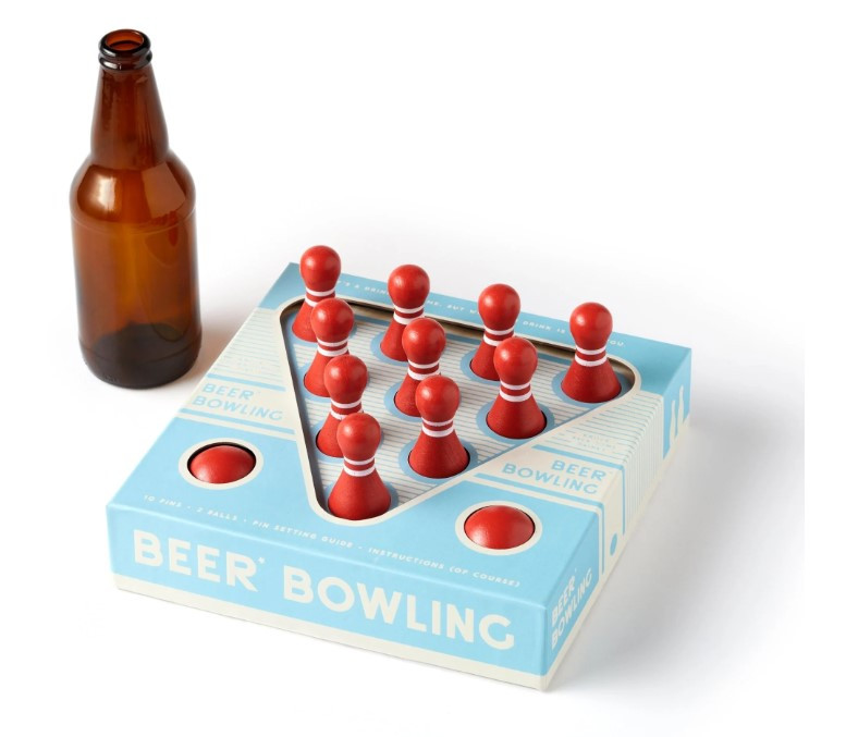 Enjoy parties with Beer Bowling Drinking Game Set, a compact tabletop bowling game with MDF pins, balls, and 3 play variations.