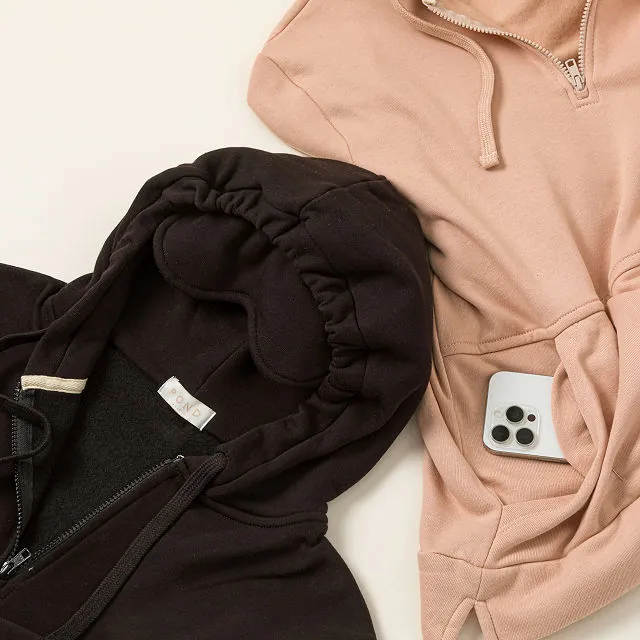 Say goodbye to awkward neck pillows and makeshift eye masks. The integrated hood mask adjusts with a pull cord for instant darkness, while a hidden pocket keeps essentials like passports or phones secure. Available in Blush or Black and a range of sizes, this hoodie blends style, convenience, and unbeatable coziness for every traveler.