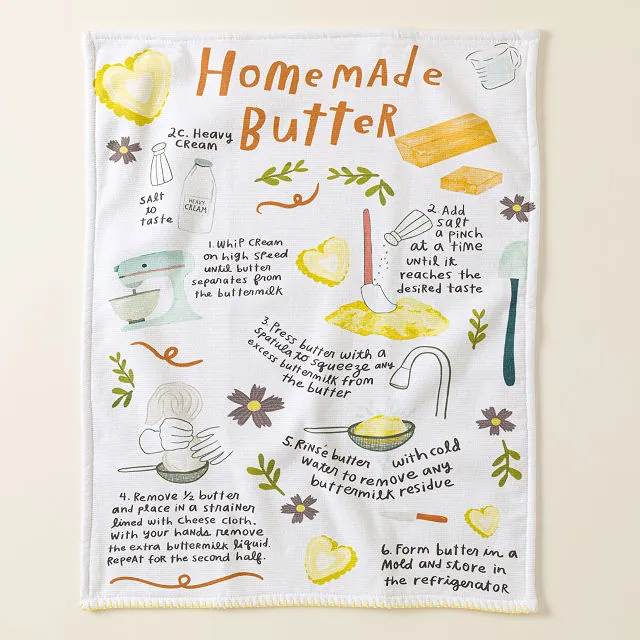 Bring both style and functionality to your kitchen with the Butter Recipe Dish Towel. Featuring hand-drawn illustrations and a step-by-step butter-making guide, this towel is perfect for cooks who love a touch of whimsy with their practical kitchen tools. Its sunny yellow stitching and cheerful design make it a delightful addition to any countertop.