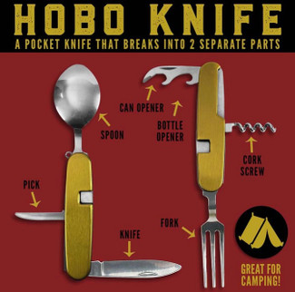Open the Hobo Knife to access the fork, spoon, and knife. Use the built-in bottle opener, can opener, and corkscrew for beverages and canned goods. After use, simply separate and fold back into its compact form for easy storage.