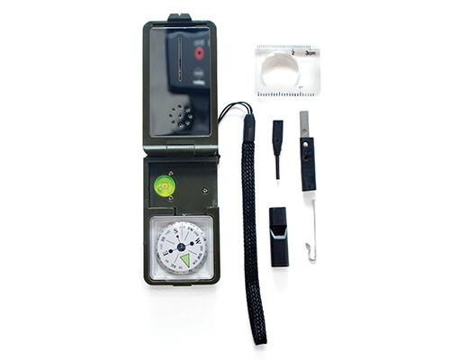 • Functions (10-in-1): Whistle, LED light, compass, fire starter flint, level, mirror, hygrometer, thermometer, ruler, magnifier