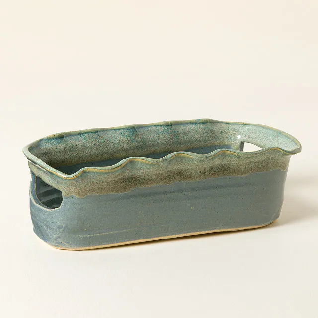 A perfect blend of functionality and artistry. Created by artisan Maggy Ames, this ceramic tea caddy is more than just storage—it’s a statement piece. Finished in a calming light blue glaze and adorned with delicate ruffle details, it brings warmth and character to your countertop. Built-in handles make it easy to carry, while its spacious interior holds up to 50 tea bags, keeping everything within reach for your daily tea ritual. Each piece is handcrafted, ensuring that no two are exactly alike.