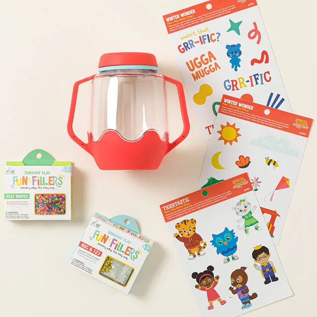 Each kit includes an orange sensory jar with a gentle color-changing LED, Daniel Tiger–themed clings for creative decoration, two fun mix-ins, and a glowing bathtime buddy. Simply fill the jar with water, add the mix-ins, and watch the mesmerizing patterns swirl as light dances through. Kids can shake, turn, and observe the calming motion perfect for moments of rest or emotional reset.