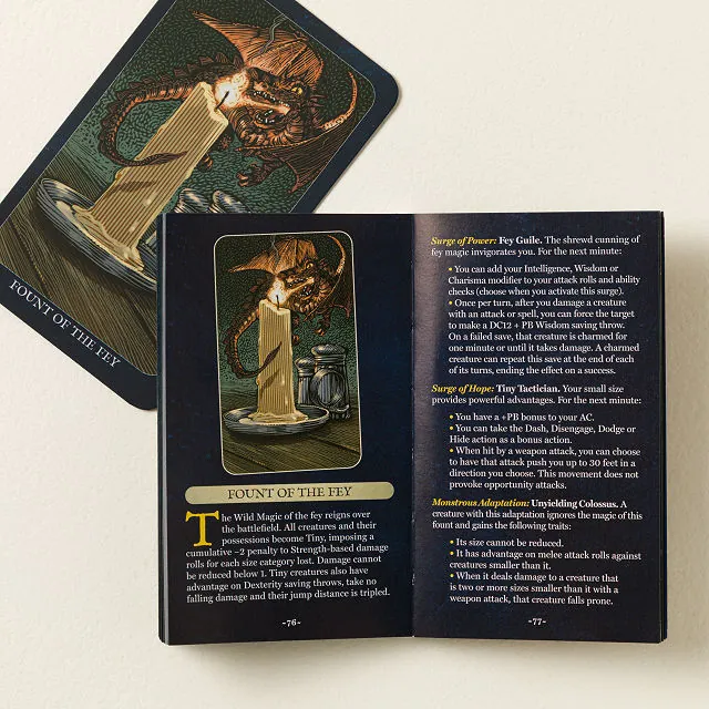 Designed to integrate seamlessly with Dungeons & Dragons 5E and other tabletop RPG systems, this deck makes it easy to inject fun, surprise, and tactical challenges into your game. Each card, from Fount of Creeping Necrosis to Fount of Giants, offers a new, unpredictable effect that transforms combat and storytelling. The included 88-page companion book provides guidance, ideas, and ways to maximize chaos for an unforgettable RPG experience.