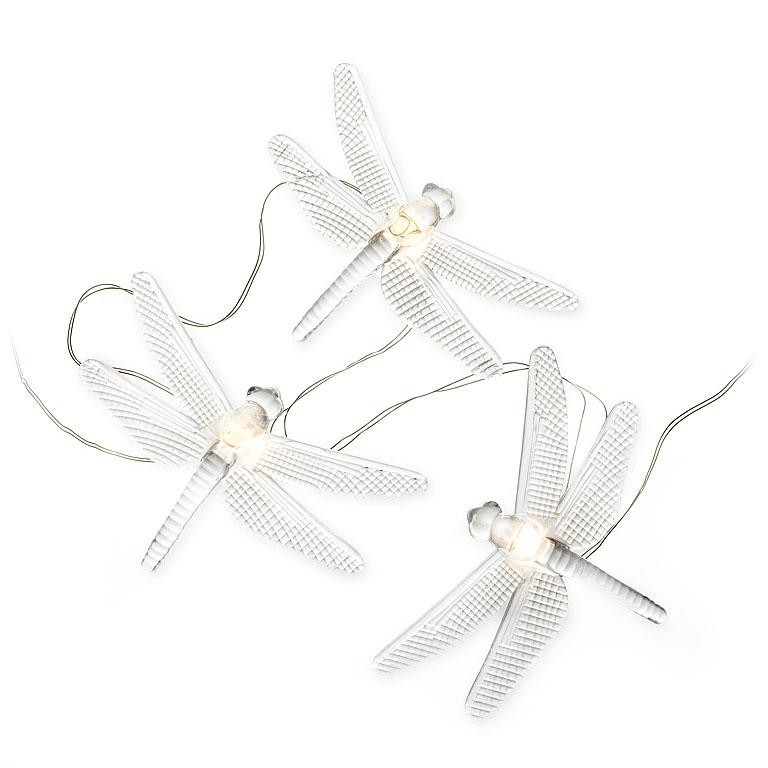 Brighten your décor with Dragonfly String Lights featuring 10 glowing LED dragonflies, flexible wire, and warm white lighting.