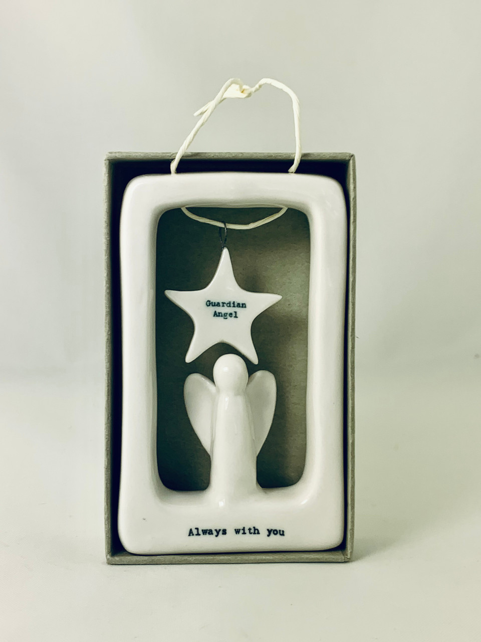 Gracefully crafted and thoughtfully designed, the East of India Hanging Porcelain Angel features a softly framed angel figure with the touching sentiment “Always with you” hand-carved on the front. This meaningful message makes it a comforting presence in any room.