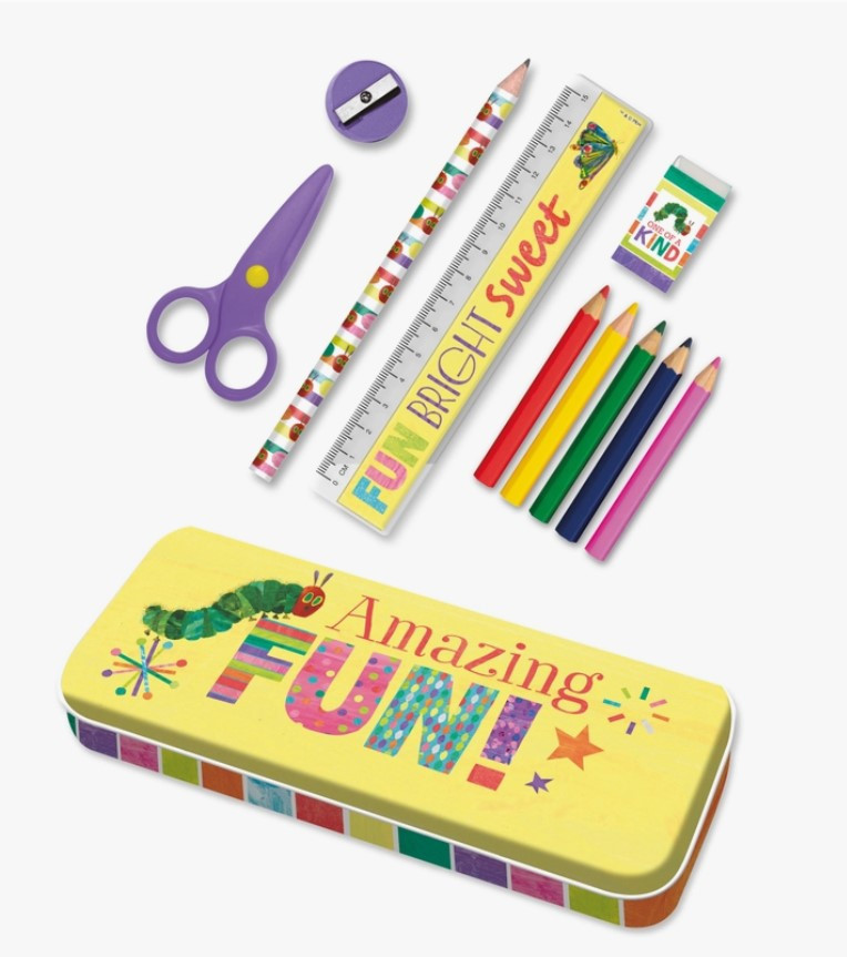 Discover the Eric Carle Stationery Tin Set with pencil, color pencils, ruler & scissors – perfect for school or creative fun.