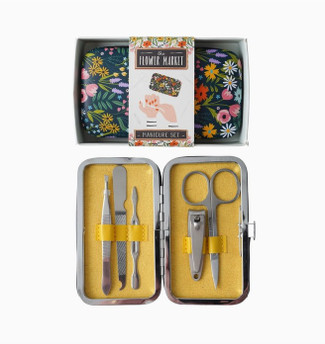 Flower Market Manicure Set offers stylish nail care essentials with stainless steel tools, perfect for travel and daily grooming.