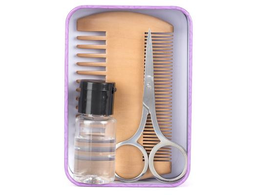 - Material: Metal tin, pear wood comb, stainless steel scissors
