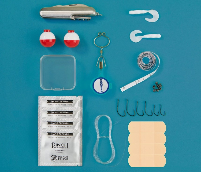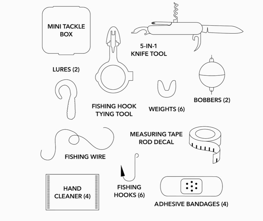 • Included Tools: Hooks, lures, wire, weights, bobbers, knife tool, hook tying tool, measuring tape, hand cleaner, adhesive bandages