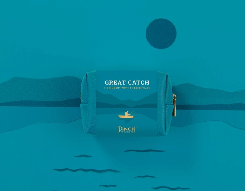 The “Great Catch” Fishing Kit offers 11 mini fishing tools in a compact vegan leather pouch, perfect for anglers and hobbyists.