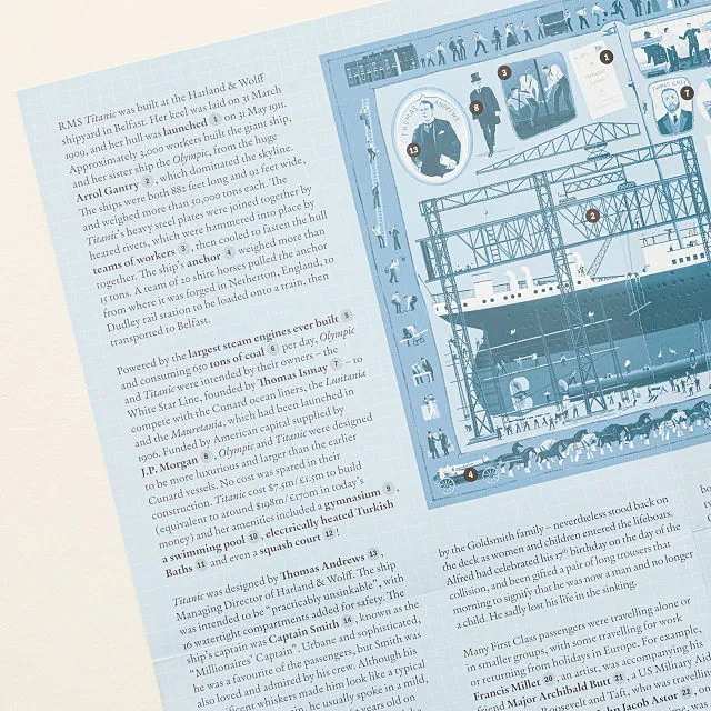 To enjoy the History of the Titanic Puzzle, spread out the pieces on a flat surface and assemble the 1,000-piece panoramic illustration. Use the included pull-out poster as a reference guide to explore the ship’s design, its opulent launch, and its fateful journey. Perfect for solo puzzling or collaborative family activity.