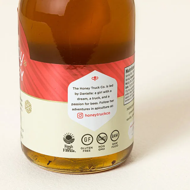 Material: Wildflower honey infused with orange peel, cinnamon, clove, vanilla, and seasonal spice blend
