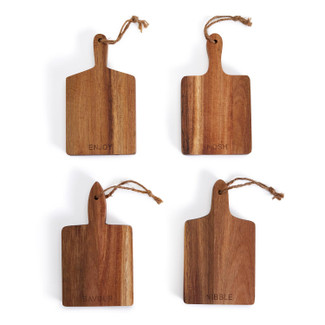 The Individual Mini Charcuterie Boards, Set of 4 are made from 100% natural Acacia wood, showcasing beautiful grain patterns that enhance their rustic appeal. Each board features an embossed sentiment—“Enjoy,” “Savor,” “Nibble,” and “Nosh”—adding a charming, personalized element. Designed with a convenient hanging loop, these boards are easy to store and display, making them both functional and decorative.