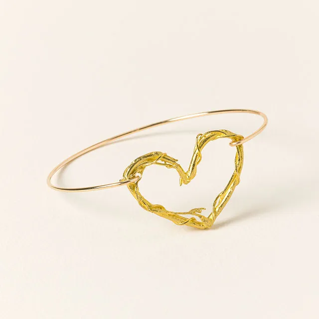 Created by Nancy Nelson, this bracelet features a handcast heart made from intertwined twigs, symbolizing the complexity and beauty of love. Set on a 12/40 yellow gold-filled bangle, it combines natural elegance with timeless design, perfect for everyday wear or special occasions.