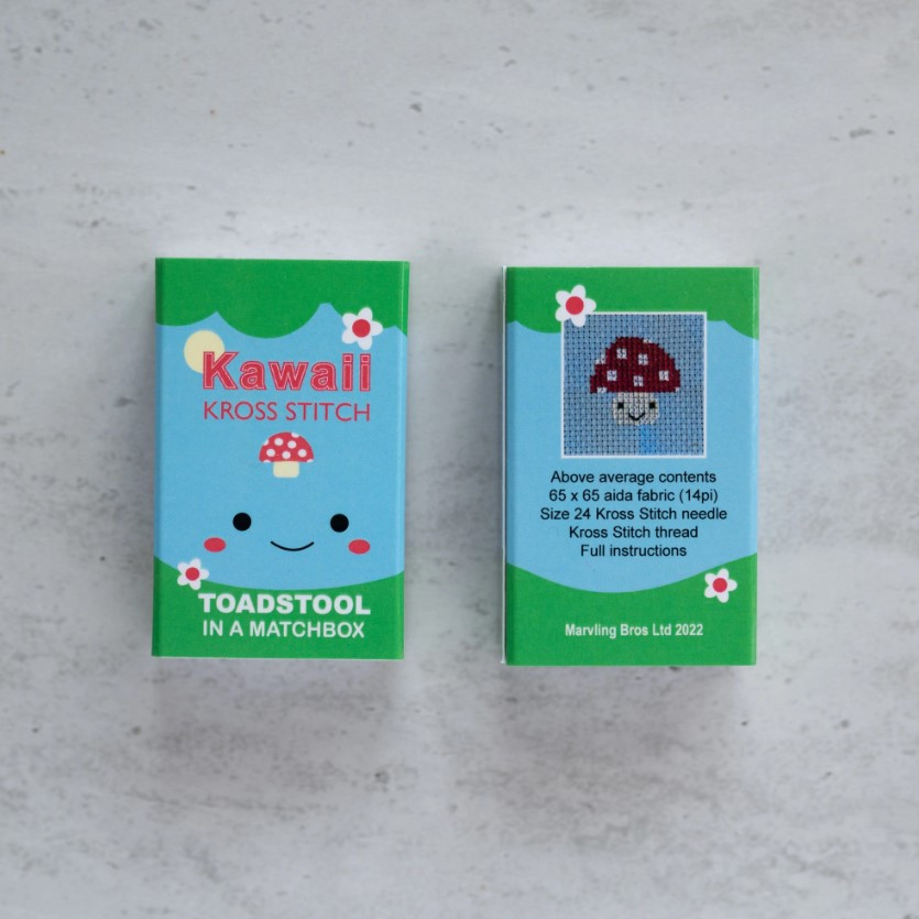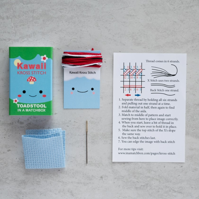 Create a cute design with Kawaii Toadstool Cross Stitch in A Matchbox! Easy DIY kit perfect for beginners and craft lovers.