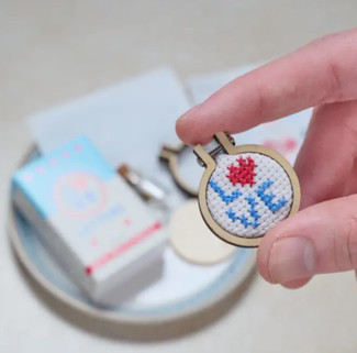 - Materials: Aida cloth, embroidery threads, mini wooden hoop, needle, instruction booklet
