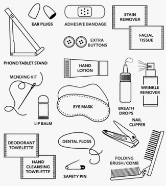 - Contents: Phone/tablet stand, eye mask, ear plugs, folding brush/comb, breath drops, dental floss, hand cleansing towelette, hand lotion, nail clipper, facial tissue, lip balm, adhesive bandage, deodorant towelette, stain remover, wrinkle remover, mending kit, safety pin, extra buttons