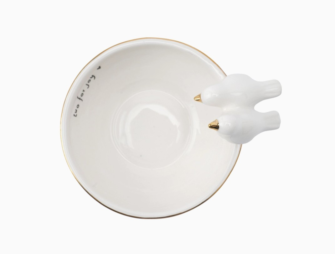Bring a touch of romance and elegance to your space with the Lovebird Ceramic Trinket Bowl. Sweet and practical, this beautifully crafted bowl features two delicate lovebirds perched gracefully on its rim, complemented by a luxurious gold trim along the edges. The inner rim is adorned with the heartwarming sentiment “two for joy,” making it a delightful gift for bird lovers and collectors alike.