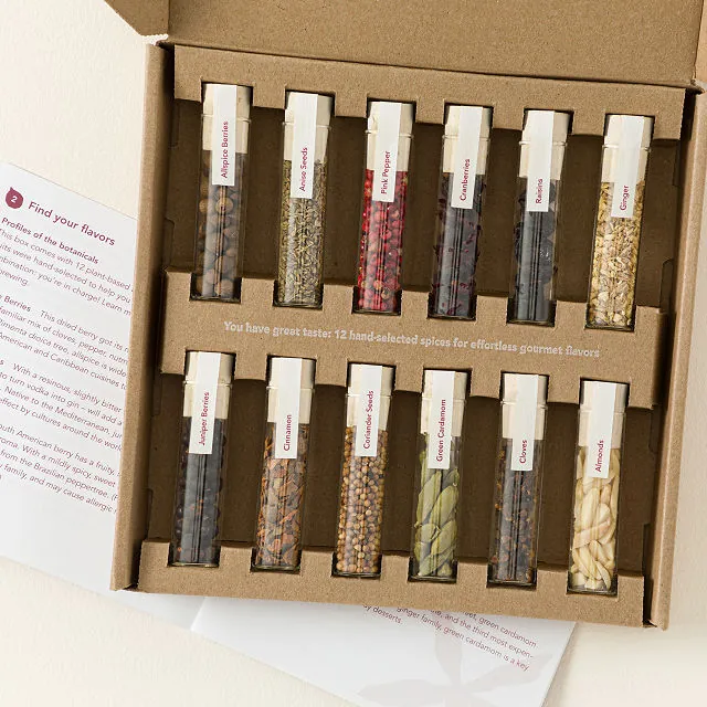 • Material / Contents: 12 spice bottles (juniper berries, orange peels, allspice, cardamom pods, cinnamon bark, lemon peels, cloves, anise seeds, ginger, cranberries, raisins, almonds, etc.)