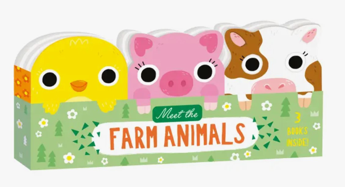 • Contents: 3 mini board books (Chicks, Pigs, Cows)