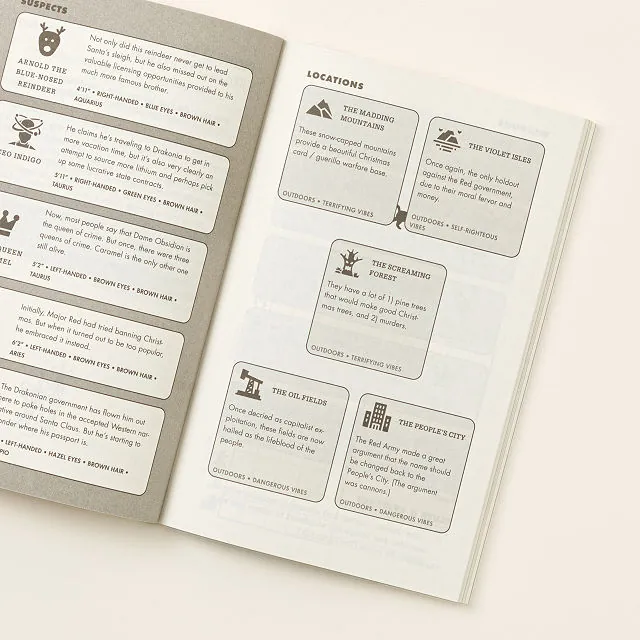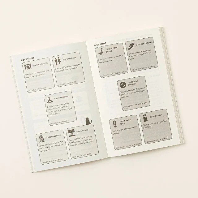 Open the book and select a puzzle to solve. Use the clues provided to determine the culprit, weapon, and motive for each case. Work sequentially to follow the larger narrative or enjoy puzzles individually. Ideal for solo play or sharing with friends and family during the holidays.