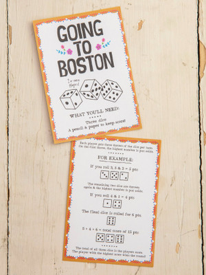 Three classic dice games: Bunco, LCR, and Going to Boston.