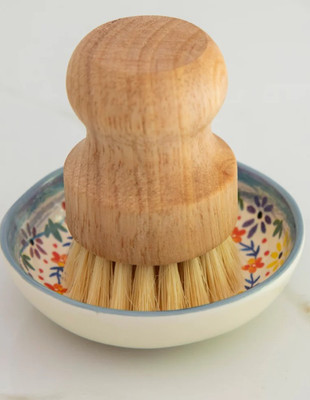 Simply wet the brush, add soap, and scrub your dishes. Store the brush in the stoneware dish between uses to keep your sink area tidy. Hand wash both brush and dish for longevity.