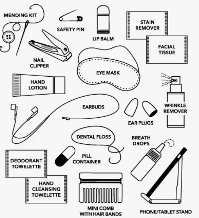 • Contents: Phone stand, nail clipper, lip balm, breath drops, hand lotion, dental floss, stain remover, hand cleaner, mini comb with hair bands, safety pin, eye mask, wrinkle remover, ear plugs, pill container, earbuds, deodorant towelette, facial tissue, mending kit