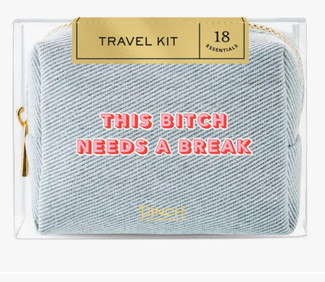 Traveling just got easier and more fun with the Needs a Break Travel Kit. Perfectly compact at 4″ wide by 3″ tall, this light denim pouch with a hint of sparkle contains 18 essential items to make any trip comfortable and stress-free. From a phone stand to an eye mask and breath drops, every item is thoughtfully chosen to keep you refreshed and ready for adventure. The sentiment “This Bitch Needs a Break” adds a playful touch to your travel routine.