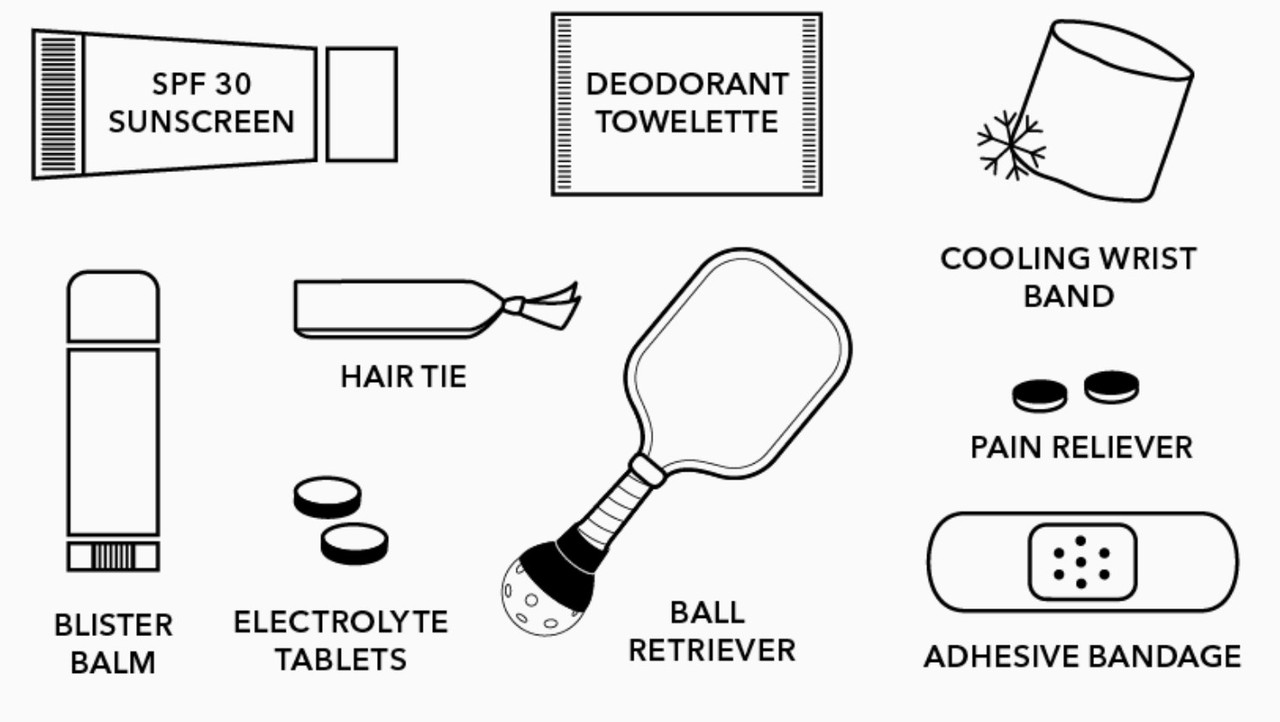• Contents: Sunscreen, hair tie, deodorant towelette, electrolyte tablets, ball retriever, cooling wristband, pain reliever, adhesive bandage, blister balm