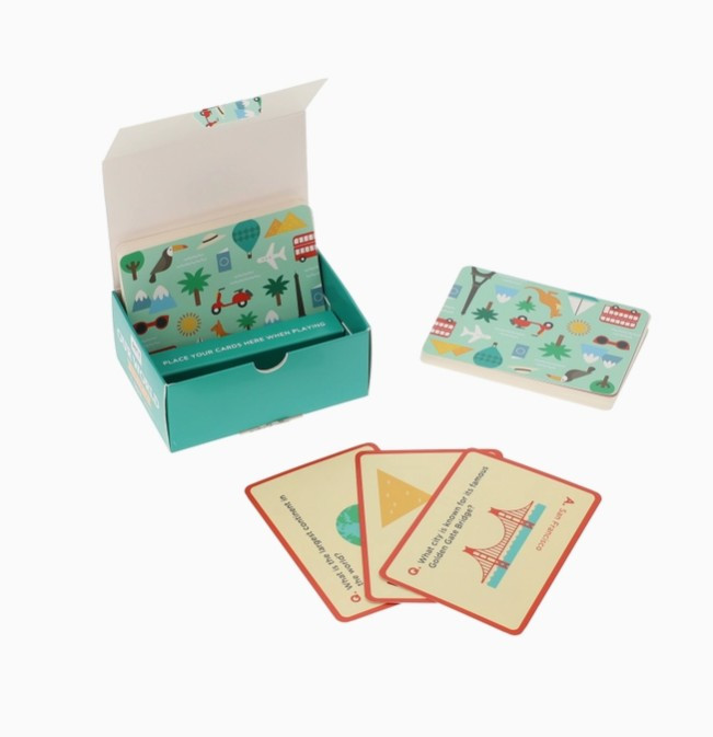 The Our World Trivia card set features 50 beautifully illustrated question cards covering cities, landmarks, animals, and more. Each card challenges players to think critically while discovering fascinating facts about the planet. The compact boxed deck, measuring 3.5″ wide × 5″ tall × 2″ deep, is perfect for travel, home, or gifting. Printed on FSC-certified paper with vegetable-based inks, it’s eco-friendly and safe for young learners.