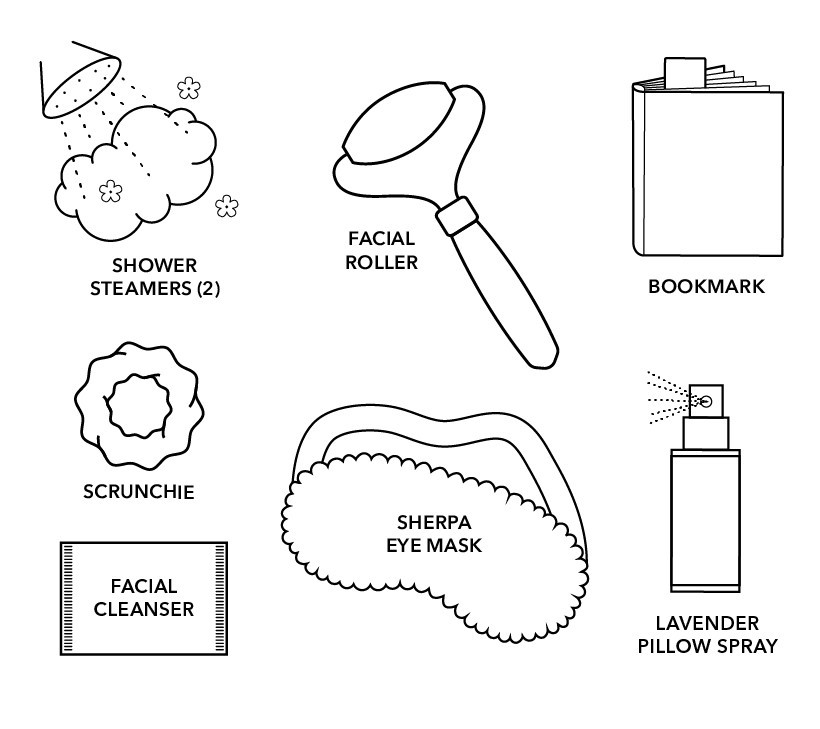 - Contents: Sherpa pouch, sleep mask, stone facial roller, silky scrunch, lavender mist, refreshing towelette, bookmark, 2 lavender shower steamers