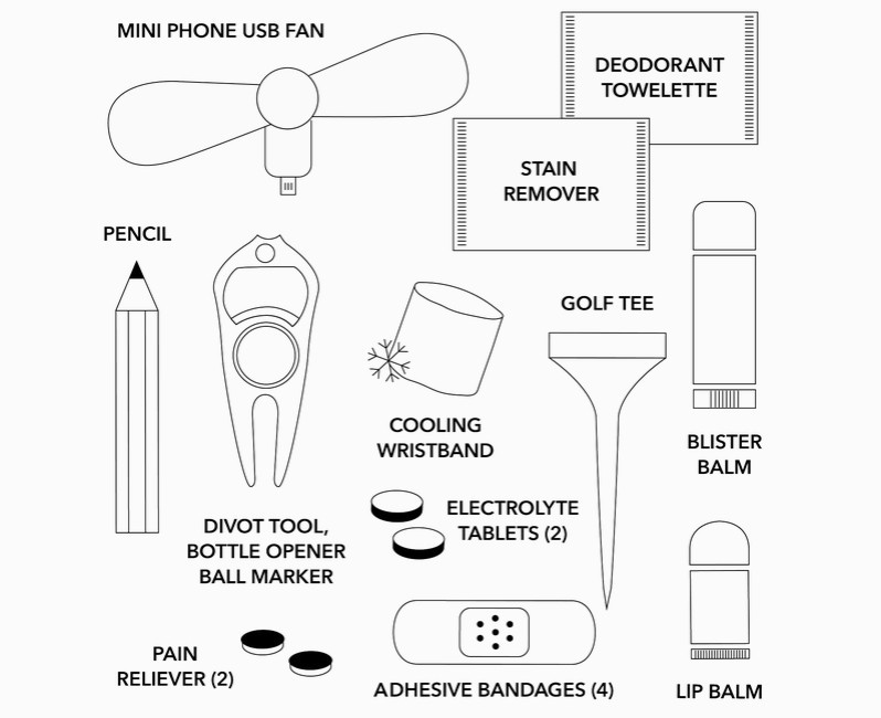 - Includes (14 items): USB phone fan, cooling wristband, golf tees, golf pencil, pain reliever, electrolytes, blister balm, SPF lip balm/sunscreen duo, stain remover, deodorant towelette, divot tool, ball marker, bottle opener, adhesive bandages