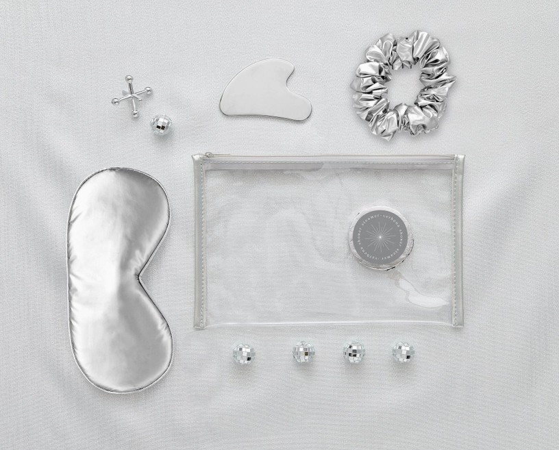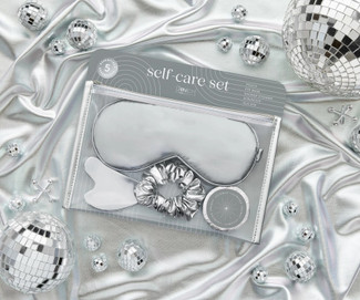 Pinch Self Care Set – Silver includes sleep mask, gua sha, scrunchie, and shower steamer for a relaxing and stylish self-care routine.