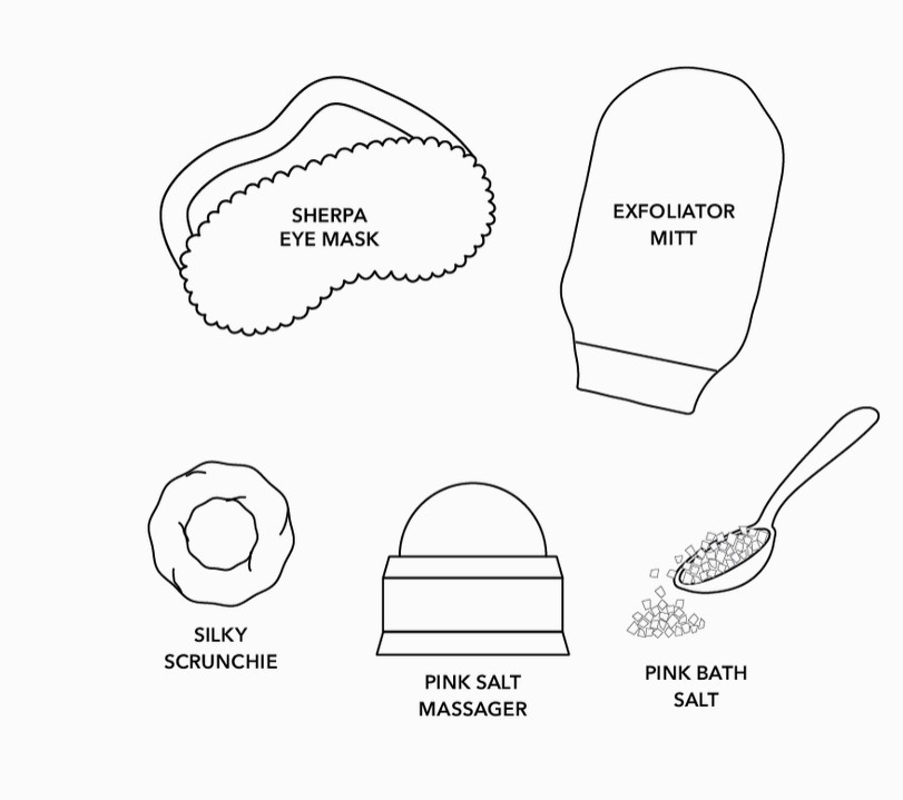 - Contents: Himalayan pink salt massager, eye mask, silky scrunchie, lavender bath salts, exfoliating mitt