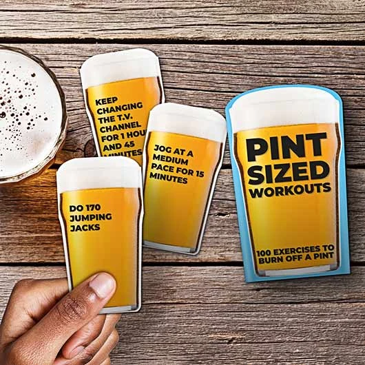 The Pint Sized Workouts Deck is designed for those who enjoy a pint of beer but want to stay on top of their fitness goals. This unique deck includes 100 workout cards, each crafted to help burn off the average calories found in a pint of lager—approximately 180 calories.