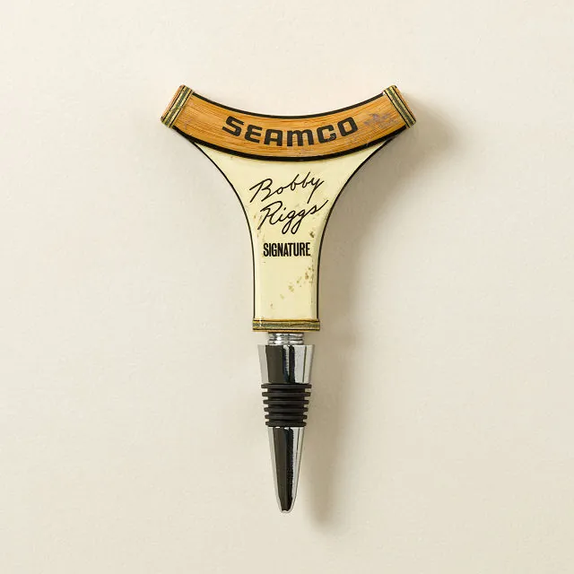 Reclaimed Tennis Racquet Wine Tool combines vintage racquet wood with corkscrew and stopper for a unique functional bar accessory.