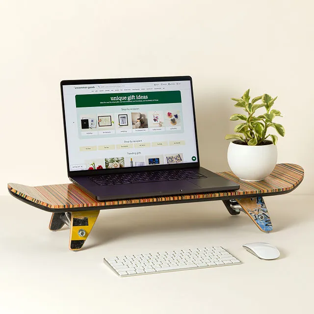 Perfect as a monitor riser, low shelf, or display base, this sturdy piece combines functionality with artistry. The mid-century-inspired legs add a modern touch, while the recycled materials make it a sustainable decor choice that honors skate culture’s spirit of reinvention.