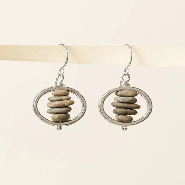 River Stone Balance Earrings handcrafted with natural pebbles in antique silver frame, offering unique, earthy elegance.