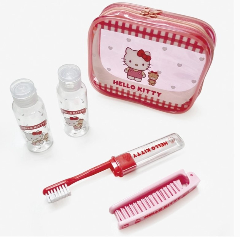 Keep essentials organized with the Sanrio Hello Kitty Travel Set, featuring containers, toothbrush, comb, and a soft pouch.