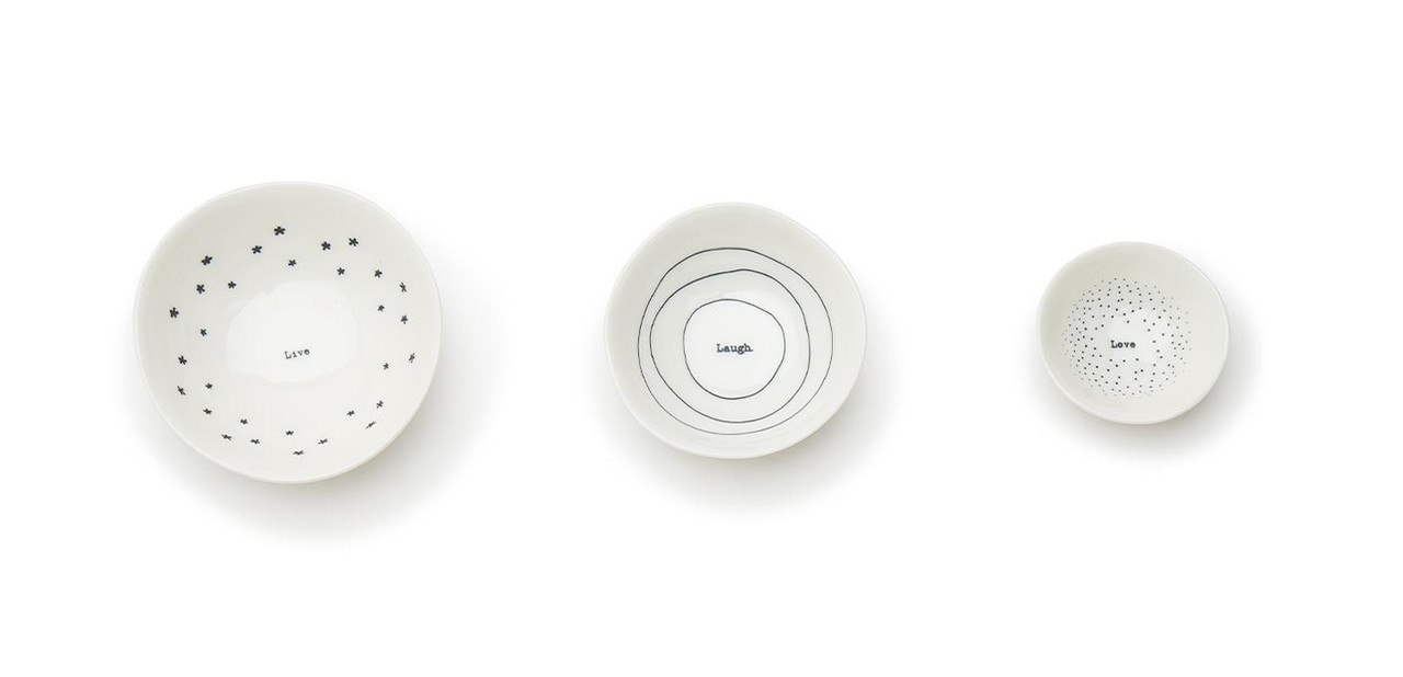 • Set Includes: 3 porcelain bowls (Live, Laugh, Love)