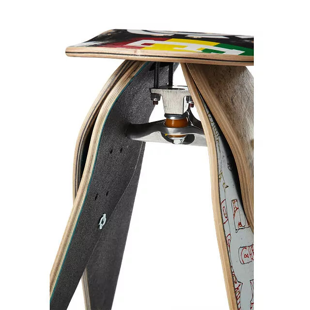 Skateboard Stool crafted from recycled decks and steel trucks, offering unique, durable seating with authentic street style and eco design.
