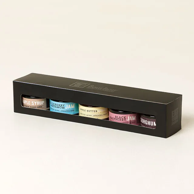 Experience the South in every jar. From the misty mornings of the Appalachians to the warmth of a bourbon barrel, these spreads capture the essence of Kentucky’s foodways. Featuring five handcrafted favorites—Apple Butter Spread, Black Raspberry Jam, Blueberry Bourbon Cardamom Jam, Bourbon Barrel Aged Maple Syrup, and Bourbon Barrel Aged Sorghum—this sampler is perfect for breakfast, desserts, or savoring straight from the jar. Handmade in Kentucky with all-natural ingredients, it’s a thoughtful gift for bourbon enthusiasts and food lovers alike.