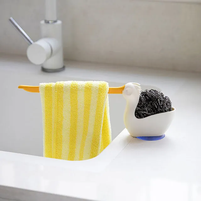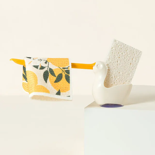 Perched patiently by your faucet, Stan the Sponge Bird offers a delightful way to keep your dishwashing area tidy. His dual holder design stores your sponge inside the body and your dishcloth draped neatly over his beak. When not in use, the beak swivels out of the way for a clean, minimalist look.